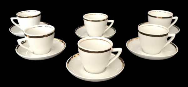 • POZZANI - Lote com 6 xícaras de café com pires em porcelana, Jundiaí. Peças brancas com filete dourado, design clássico e elegante.