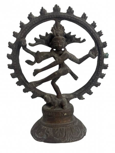 • Escultura indiana em bronze representando Shiva Nataraja, o Senhor da Dança Cósmica. A peça exibe rica simbologia espiritual, com a figura envolta em arco de chamas e base decorada. Trabalho artesanal de inspiração hindu, com pátina natural e traços finos que revelam sua expressividade e caráter devocional. Ideal para colecionadores e ambientes de meditação. Mede 13cm x 10cm.
