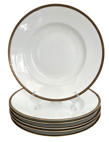 • BAVARIA - ROSENTHAL  Selb Bavaria.Elegante conjunto de 6 pratos fundos em pasta de porcelana fina alemã, bordas decoradas com filete dourado e delicado motivo em relevo. Peças de excelente qualidade e conservação, marcadas na base. Meados séc. XIX. Mede