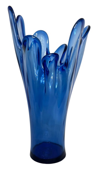 • Vaso em pasta de vidro na cor azul com borda em movimento. Mede 50 x 28cm.