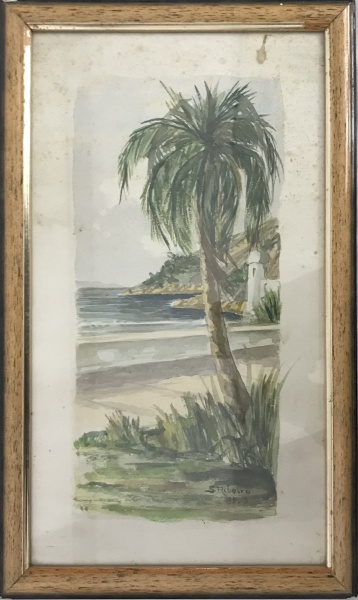 • S. RIBEIRO - Aquarela em papel cartão sobreposta em fórmica e protegida por moldura e vidro. Assinatura e ano (1963) no canto inferior direito. 24cm x 40cm.