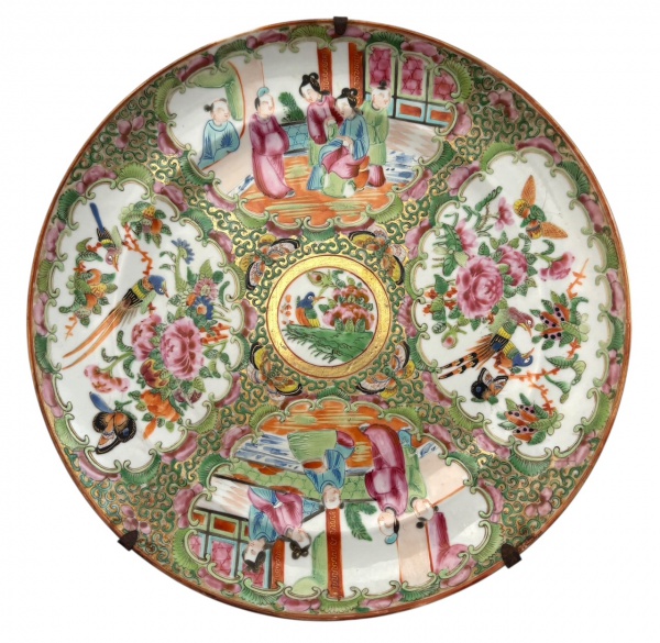 • COMPANHIA DAS INDIAS - Secular prato para parede em companhia das índias, período "família rosa", meados século XIX. Possui suporte em metal original da época. Mede 24cm diâmetro.