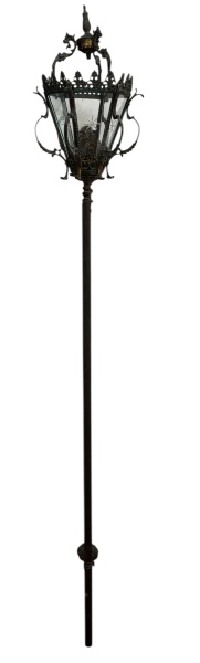 • Antiga luminária de parede em ferro e bronze, estilo carruagem, falta um dos vidros. Mede 1,80cm altura.