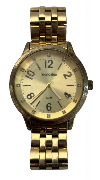 • MONDAINE - Relogio de pulso com pulseira e mostrador em metal dourado, desgaste do tempo. Funcionando. Medida do visor 4,5cm.