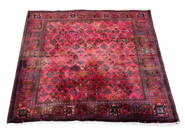 • Tapete persa ISFAHAN, figuras policromadas sobre fundo vermelho com proteção de couro nas laterais e franja. Mede 2,15 x 2,10cm.