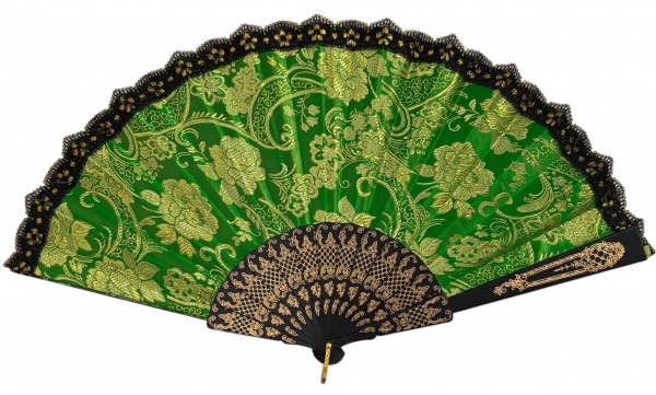 • Grande e exuberante leque oriental, fartamente adornado com flores douradas sobre tecido verde. Estrutura em material sintético, ótimo estado de conservação. Mede aberto 56 x 32cm.