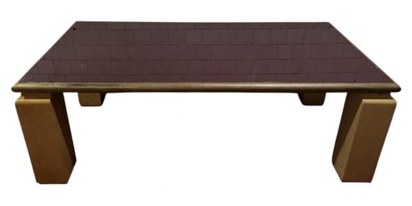 • Mesa de jantar em madeira laqueada, tampo em linhas retas com proteção de vidro e laterais em cobre/metal. Marcas do tempo. Meados anos 70. Mede 78cm altura x 1,10cm largura x 2,20cm comprimento.
