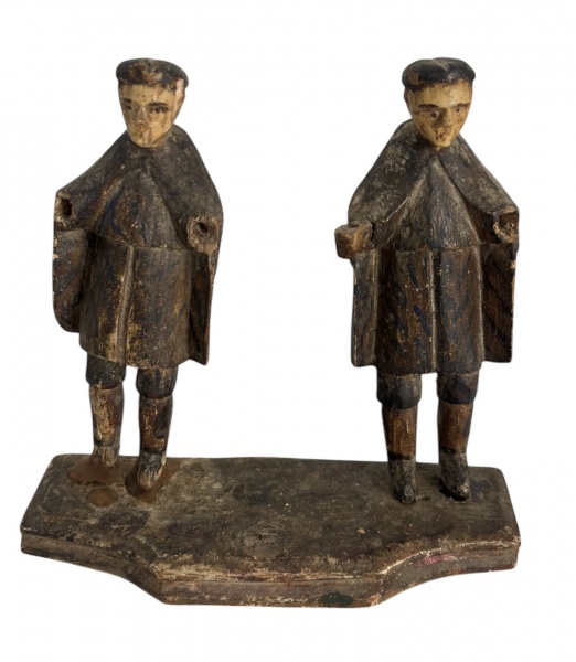 • MINAS SÉC. XX - Escultura sacra em madeira entalhada e policromada, representando São Cosme e São Damião, dispostos sobre base única. Trabalho artesanal, provável primeira metade do século XX, com pátina original e desgastes compatíveis com a idade. Peça devocional de forte caráter popular. Mede 12 x 13 cm.