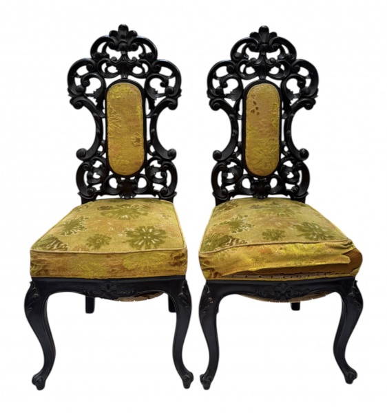 • Par de cadeiras em madeira escura entalhada, espaldar vazado com rica ornamentação, pés curvos, estofamento em veludo floral tom mostarda, apresentando desgastes e marcas do tempo. No estado. Mede 1,15 cm altura.