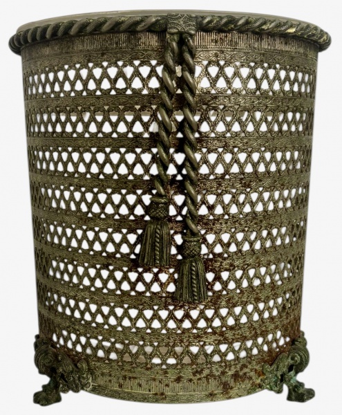 • Cesto decorativo em metal vazado patinado, ricamente trabalhado, com borda superior em relevo, aplicação frontal de cordões entrelaçados com pingentes e base apoiada em quatro pés ornamentados. Apresenta oxidação compatível com a idade. Peça decorativa de grande efeito para ambientação clássica ou eclética. Mede 26cm x 23cm.