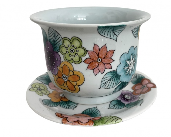 • Floreira em porcelana decorada com motivo floral policromado, acabamento esmaltado, peça de bom porte, assinatura na base. Em bom estado de conservação. Mede 13 cm.