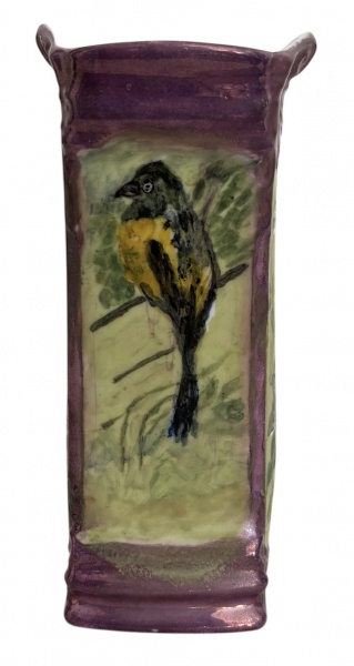 • Vaso em faiança artística, estilo Art Nouveau, policromado, com painéis pintados à mão representando flores e pássaro, bordas em tom violáceo, assinatura e marca na base, apresentando marcas do tempo. Mede 17 cm altura.