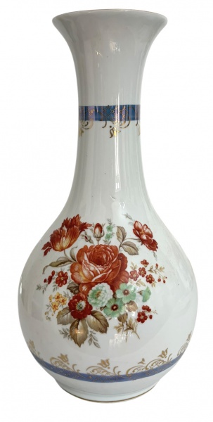 • Vaso em porcelana Real, formato balaústre, decoração floral policromada com detalhes em dourado e frisos azuis. Peça de elegante acabamento, ideal para composição decorativa. Registro na base. Mede 35 cm altura.