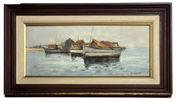• MAURICIO MACHADO - Obra em óleo sobre madeira representando marinha portuguesa com embarcações, assinada por Maurício Machado. Verso identificado: O.S.M.  Marinha Portugal, datada de 1994. Acompanha moldura em madeira com pequena perda. Medida da obra 55 x 23 cm. Medida total 73 x 41 cm.