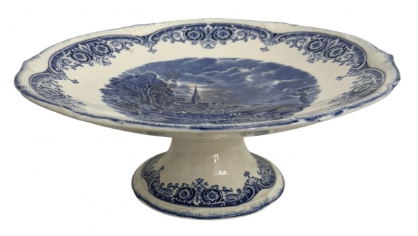• Elegante fruteira e ou centro de mesa em porcelana inglesa, decoração azul transferware com cena Salisbury Cathedral, borda floral clássica e base pedestal. Marca Made in England no reverso. Peça decorativa e utilitária, de inspiração vitoriana. Mede 24,5 cm diâmetro.