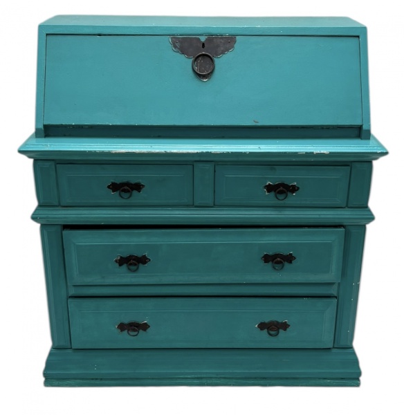 • Escrivaninha-cômoda em madeira, com tampo basculante formando mesa de escrita, interior com nichos organizadores, três gavetas inferiores e duas gavetas superiores. Pintura em tom azul-turquesa, ferragens metálicas originais. Peça funcional e decorativa, ideal para escritório ou ambiente residencial. Medidas 1,05 x 48 x 98 cm.