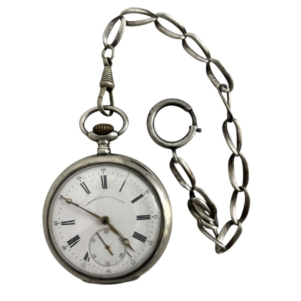 • Raro relógio de bolso Chronomètre Paragon, em prata de lei, mostrador esmaltado com algarismos romanos e ponteiros dourados, pequeno segundeiro às 6 horas, tampa frontal articulada e verso liso com cartela para monograma. Acompanha corrente original. Peça antiga, de fino acabamento e grande interesse colecionável. Não testado. Meados séc. XIX. Mede 31 cm a contar com a corrente. Peso bruto 99,6 g.