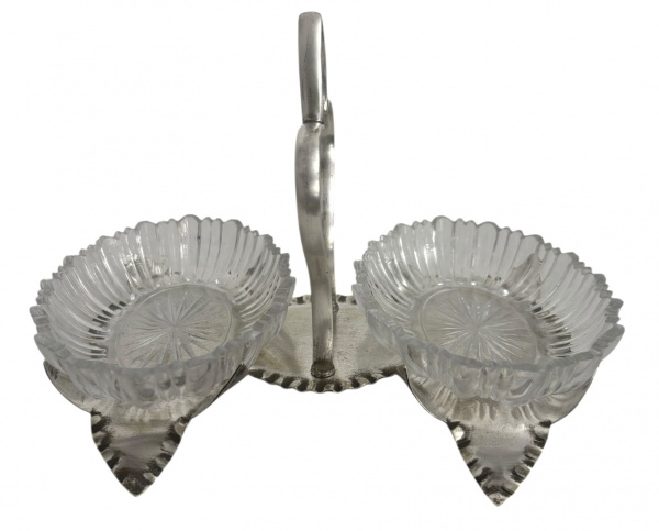 • Petisqueira dupla de mesa em metal espessurado com marcas, base recortada com alça central, acompanhada de dois recipientes em cristal lapidado. Peça de mesa elegante, de provável produção europeia, início do século XX. Apresenta marcas de contraste na base. Bom estado geral, com marcas do tempo compatíveis com a idade e imperceptível bicado. Mede 23 x 16 cm.