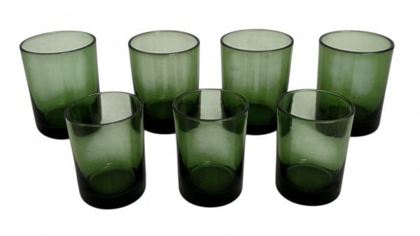 • Conjunto com 7 copos em vidro verde, de desenho cilíndrico e base mais espessa, em tom degradê. Peças de estética simples e elegante, adequadas para uso cotidiano ou decorativo, produção do século XX. Bom estado geral, com leves marcas do tempo compatíveis com a idade. Medida do maior 7 cm.