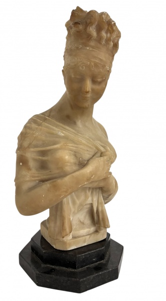 • EUROPA SÉC. XIX - Imponente busto em alabastro da socialite francesa JULIETTE RÉCAMIER Juliette Récamier (1777-1849)  uma célebre anfitriã de salão literário em Paris, inspirado na obra do escultor Joseph Chinard. Obra assinada. Mede 40 cm de altura a contar com a base de granito em formato oitavado duplo.