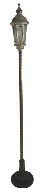 • Luminária de pé em forma de lampião urbano séc. XIX, corpo metálico com detalhes rendilhados, haste espiralada e base pesada. Peça decorativa de charme clássico, com acabamento patinado e vidro fosco. Ideal para ambientes que pedem um toque antigo e elegante. Funcionando. Mede 1,95 cm altura.