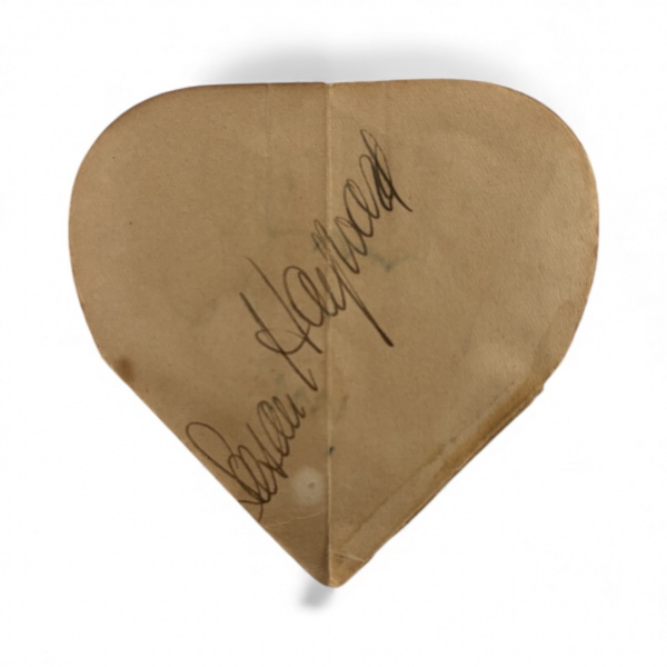 • SUSAN HAYWARD (Nova York, 1917 - Hollywood, 1975) - Raríssimo autógrafo original da atriz Susan Hayward, escrito em papel recortado em formato orgânico, com tinta firme e assinatura claramente legível. Adquirido durante visita da atriz ao Rio de Janeiro nos anos 60. Peça rara de memorabilia hollywoodiana, preservando o charme e a autenticidade da estrela vencedora do Oscar. Ideal para colecionadores de cinema clássico. Possui outro autografo no verso. Mede 8 x 7 cm.