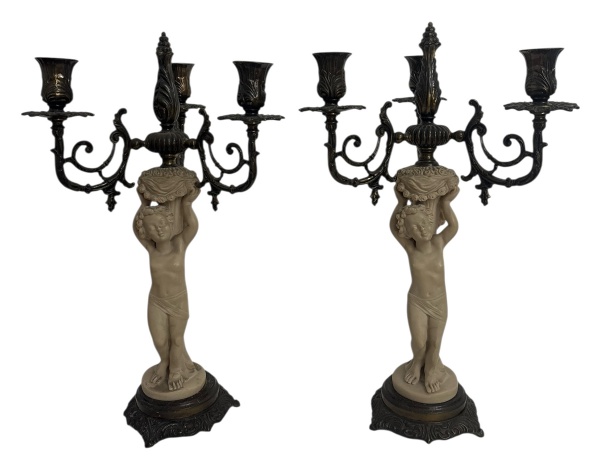 • ITALIA - Par de imponentes candelabros antigos, estrutura em bronze trabalhado com haste central em figura de putto em resina italiana, três luzes em cada peça, ricos arabescos e base decorada. Assinados na parte inferior. Peças decorativas de forte presença, ideais para ambientes clássicos. Mede 42 cm altura.