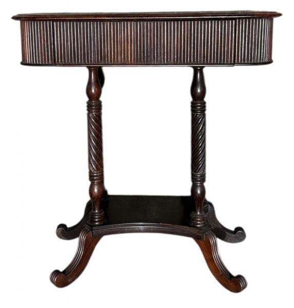 • PERIODO 1900 - Mesa auxiliar estilo Dona Maria I, em madeira nobre, com frisos verticais na caixa, gaveta frontal ampla e quatro colunas torneadas com delicado entalhe espiral. Base arqueada com pés recurvados, típica da elegância luso-brasileira do período. Peça rara e decorativa para composição clássica. Mede 60 cm altura x 35 largura x 55 frontal.