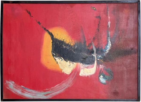 • Obra abstrata sobre tela, composição em tons predominantes de vermelho com intervenções em preto, branco e nuances terrosas, apresentando gestualidade expressiva e matéria evidente. Assinatura não identificada. Chassi no estado. Medida total 72 x 52 cm.