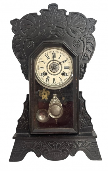 • Relógio de mesa Ansonia, acondicionado em caixa de madeira entalhada de inspiração vitoriana, mostrador circular com algarismos romanos, movimento mecânico a corda, pêndulo e chave originais, visor frontal em vidro. Produção norte-americana, final do século XIX / início do século XX. Marca: Ansonia Clock Company. Funcionamento desconhecido. Mede 60 cm altura x 35 cm largura.