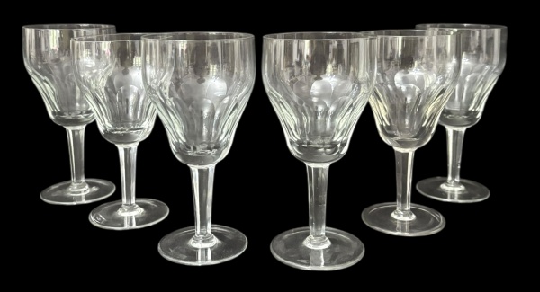 • Conjunto de 6 taças em cristal translucido, bojo facetado em desenho elegante dito "dedão', haste longa e base circular. Peças de boa transparência e harmonia, ideais para vinhos ou mesa clássica. Mede 16 cm.