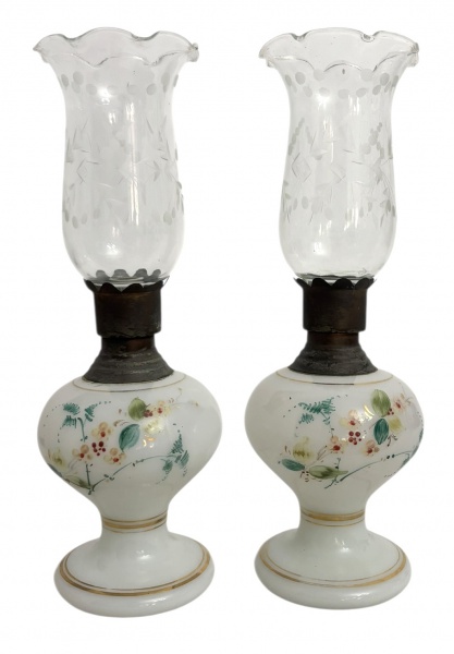 • Par de abat-jours em opalina leitosa pintado à mão com motivos florais policromados, detalhe em dourado e parte superior metálica. Cúpulas originais em tecido bege. Marcas do tempo. Mede 30cm x 10,5cm.