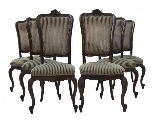 • LUIS XV - Conjunto de 6 cadeiras em madeira entalhada, estilo francês Luis XV, com estofado em veludo listrado. Espaldar alto com entalhe de florão em destaque. Elegância e sofisticação para compor ambientes refinados. Mede 1,10cm altura x 45cm largura.
