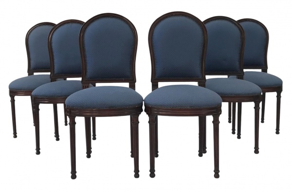 • LUIS XVI - Jogo de seis cadeiras de estilo francês Luis XI, com estrutura em jacarandá, assento e encosto estofados em tecido adamascado na cor azul. Apresenta assinatura. Elegantes e sofisticadas. Mede 95cm altura x 37cm largura x 45cm comprimento.