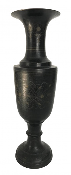 • Antigo vaso em metal escuro, de forma alongada com base e boca alargadas, apresentando finos arabescos gravados e detalhes dourados. Peça de elegante design clássico, ideal para composição ornamental. Mede 31cm altura.