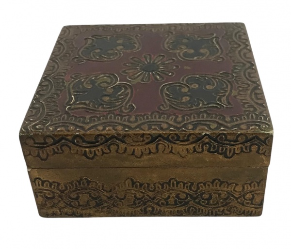 • Caixa / porta joias em madeira dourada com aplicação de motivo floral em relevo e pintura esmaltada nas cores vermelho, dourado e preto. Interior revestido em veludo vermelho.Peça de feitura artesanal, com trabalho ornamental em estilo renascentista.Mede 9cm x 4cm.