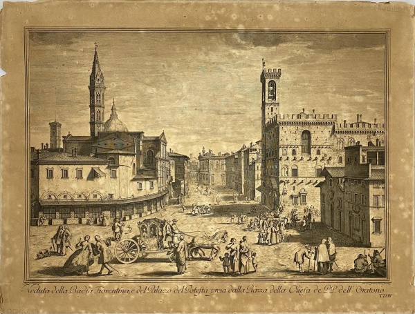 • ITALIA - Antiga "água forte", Veduta della Badia Fiorentina, Italia, por Joseph Zocchi Delin. Perdas nas laterais. Mede 58 x 76cm.