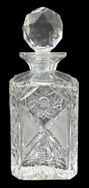 • Garrafa/decantador em cristal europeu fartamente lapidado, corpo facetado com ricos padrões geométricos e tampa original em cristal lapidado. Peça elegante e decorativa, ideal para bar ou coleção. Mede 22 cm.