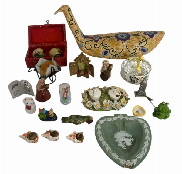 • Lote decorativo com objetos diversos, composto por ave decorativa em cerâmica policromada, caixa forrada contendo esferas pintadas à mão, castiçais, pequenas esculturas e bibelôs em porcelana, resina e metal, miniaturas, porta-velas, prato em formato de coração com decoração em relevo, peças religiosas e itens de fantasia. Conjunto variado para decoração e coleção. No estado. Total de 20 peças, medida da maior 30cm.