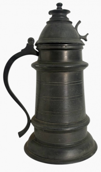• Caneca antiga em estanho, com tampa articulada, corpo cilíndrico com frisos, alça vazada e acabamento em pátina escura. Peça de estilo europeu, ideal para coleção ou decoração. Mede 28cm.