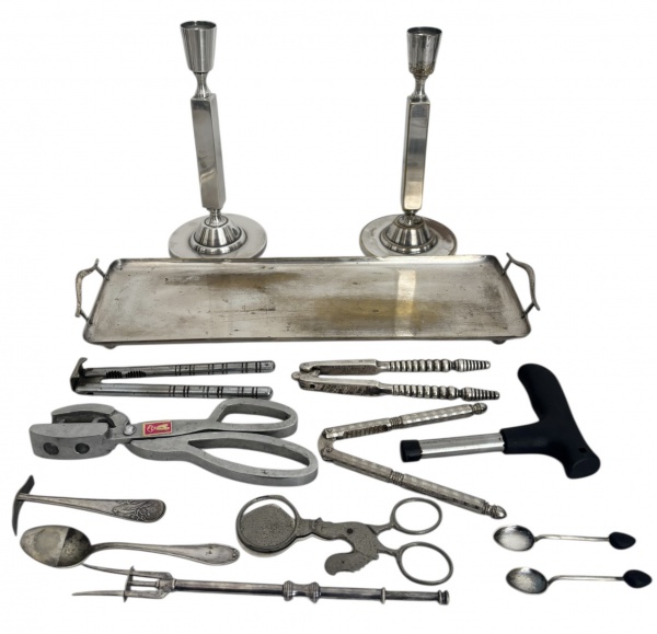• Conjunto com bandeja retangular em metal prateado, par de castiçais sendo um no estado e seleção de utensílios antigos em metal, incluindo pinças, alicates, colheres, espátulas e peças diversas, com pátina do tempo e sinais de uso compatíveis com a idade. Lote decorativo e colecionável. Total de 13 peças, medida da maior 38cm.