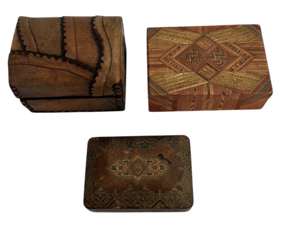 • Lote composto por três caixas antigas decorativas, sendo: uma caixa revestida em couro com costuras aparentes e fecho metálico, uma caixa em marchetaria policromada com interior forrado em tecido vermelho, e uma caixa laqueada com decoração floral dourada. Peças de caráter decorativo e colecionável, apresentando sinais naturais do tempo. Medida da maior 12 cm.